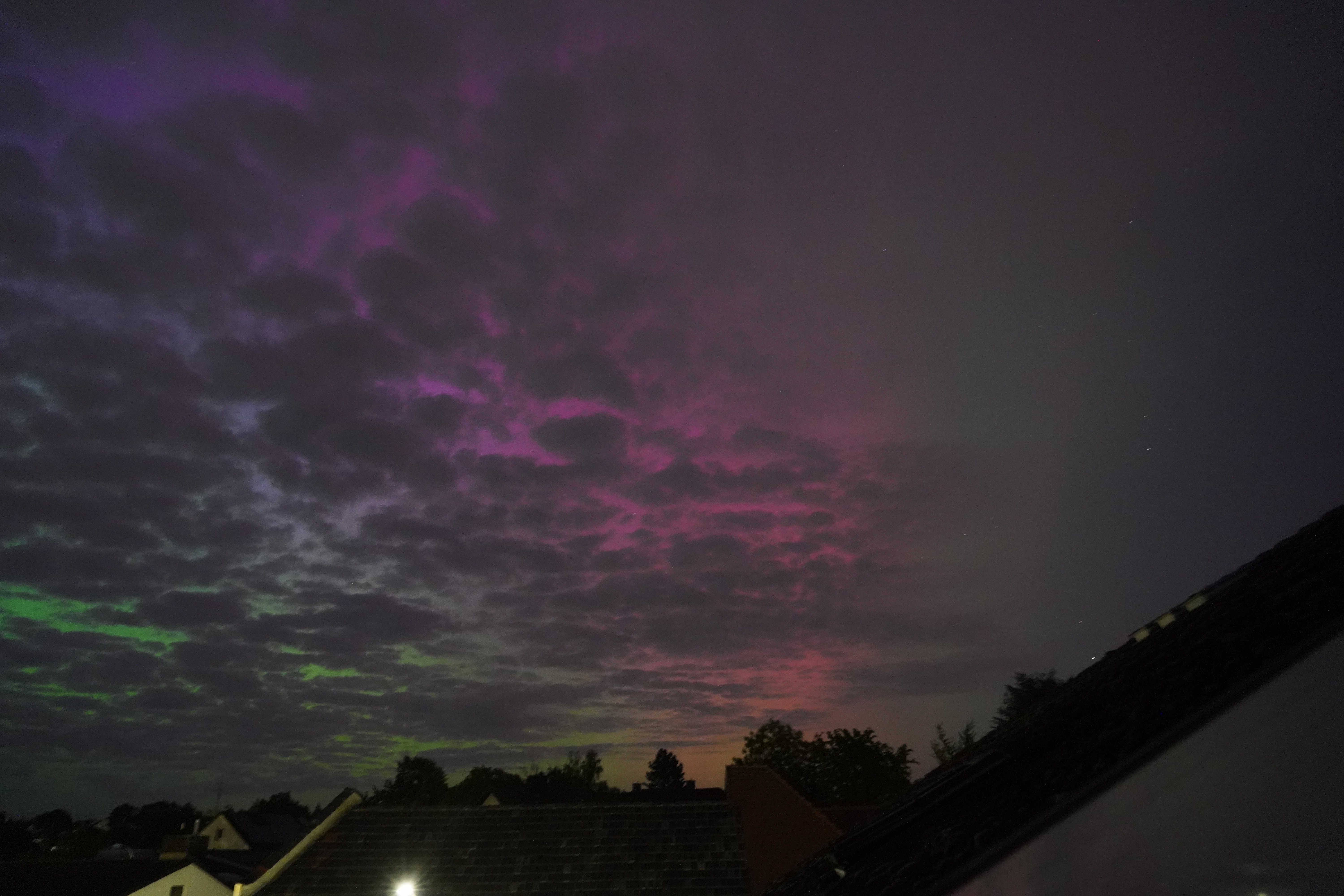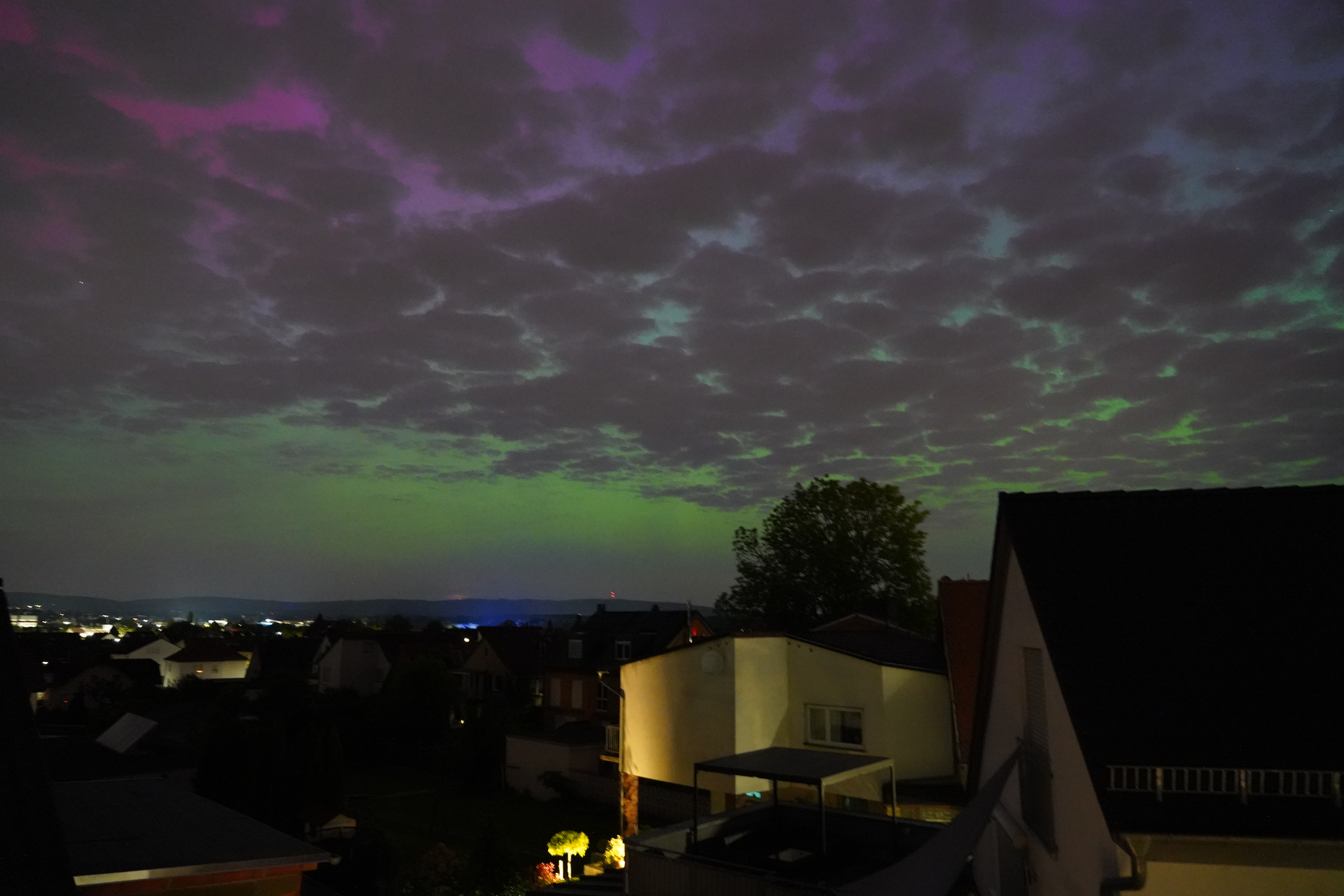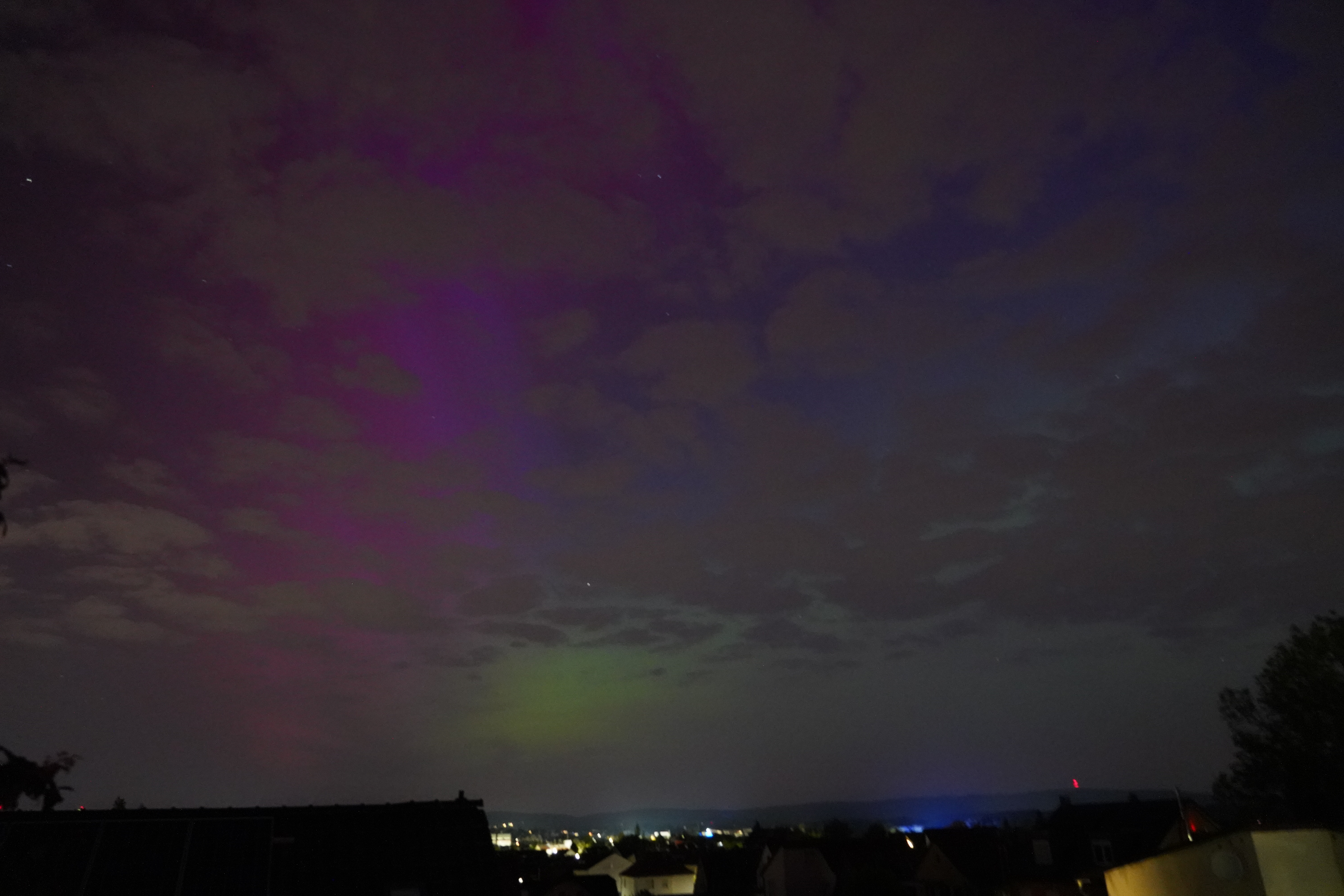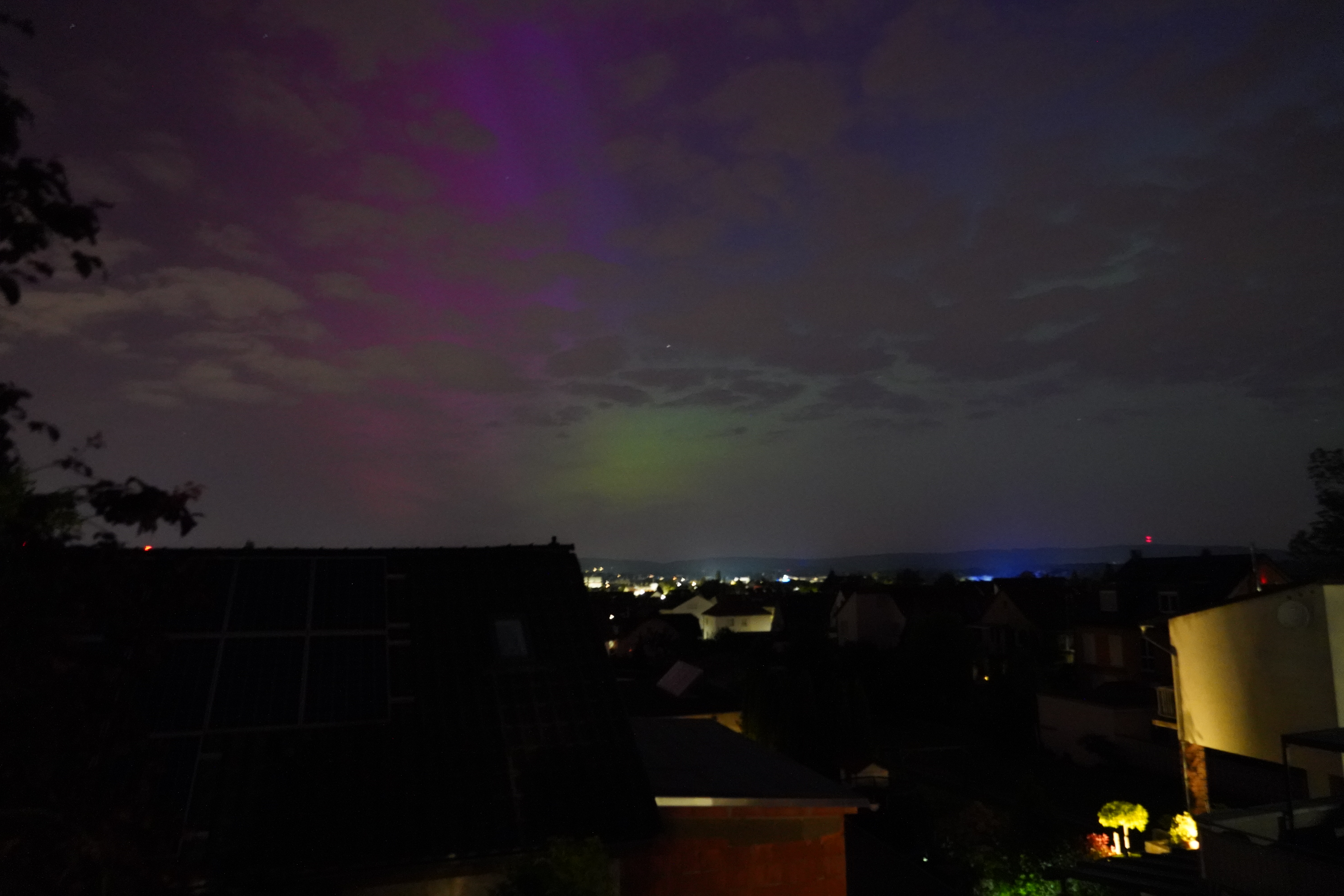 Am 10. Mai stieg der Kp-Wert so hoch über Deutschland (über 7), dass selbst bei uns zu Hause in Karben Polarlichter zu sehen waren, und auch noch in vielen Farben. Der Kp-Wert ist eine Kennziffer (daher "K") von 0 bis 9, welche die Störung des Erdmagnetfelds angibt. Je höher sie ist, umso wahrscheinlicher ist die Sichtung von Polarlichtern.