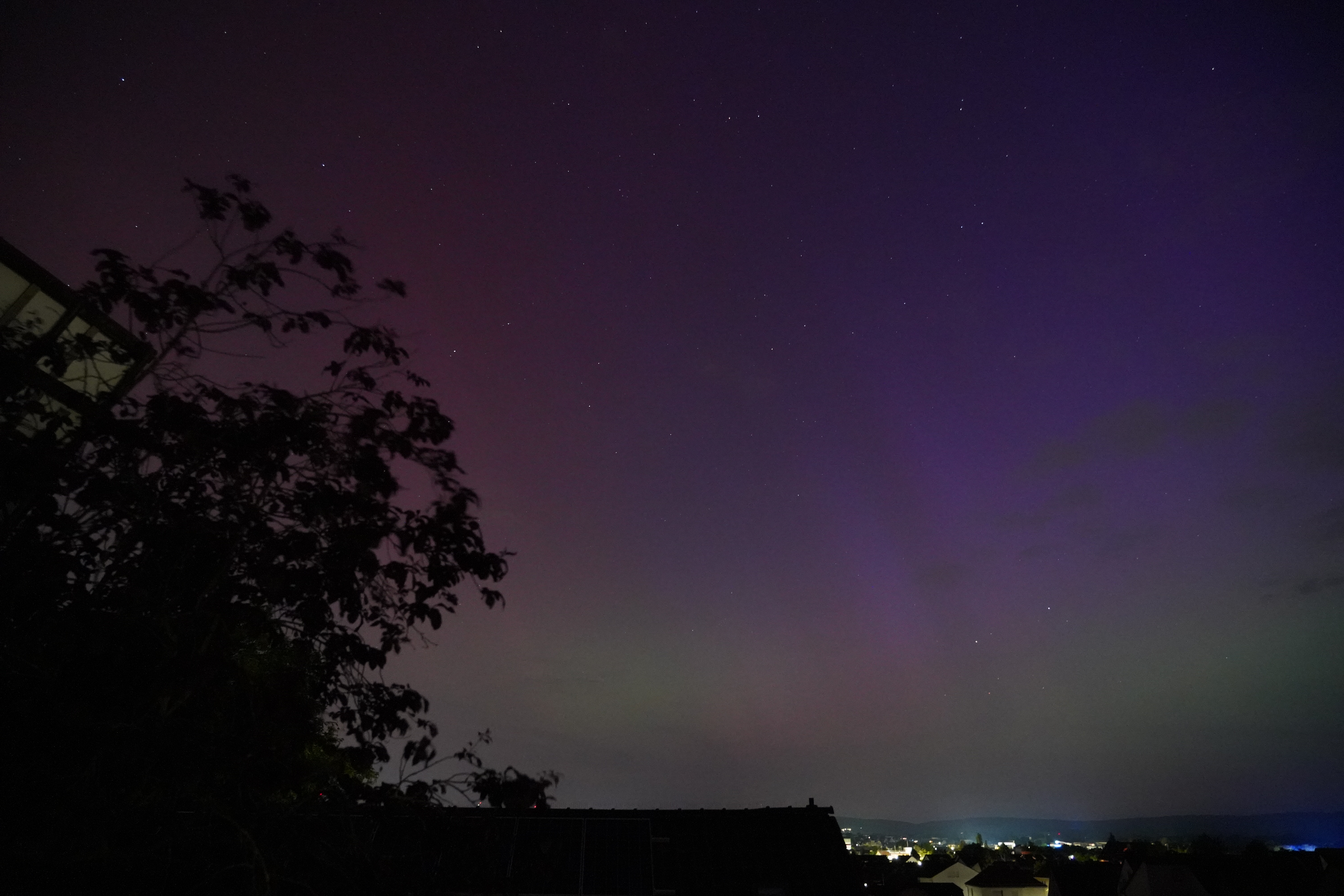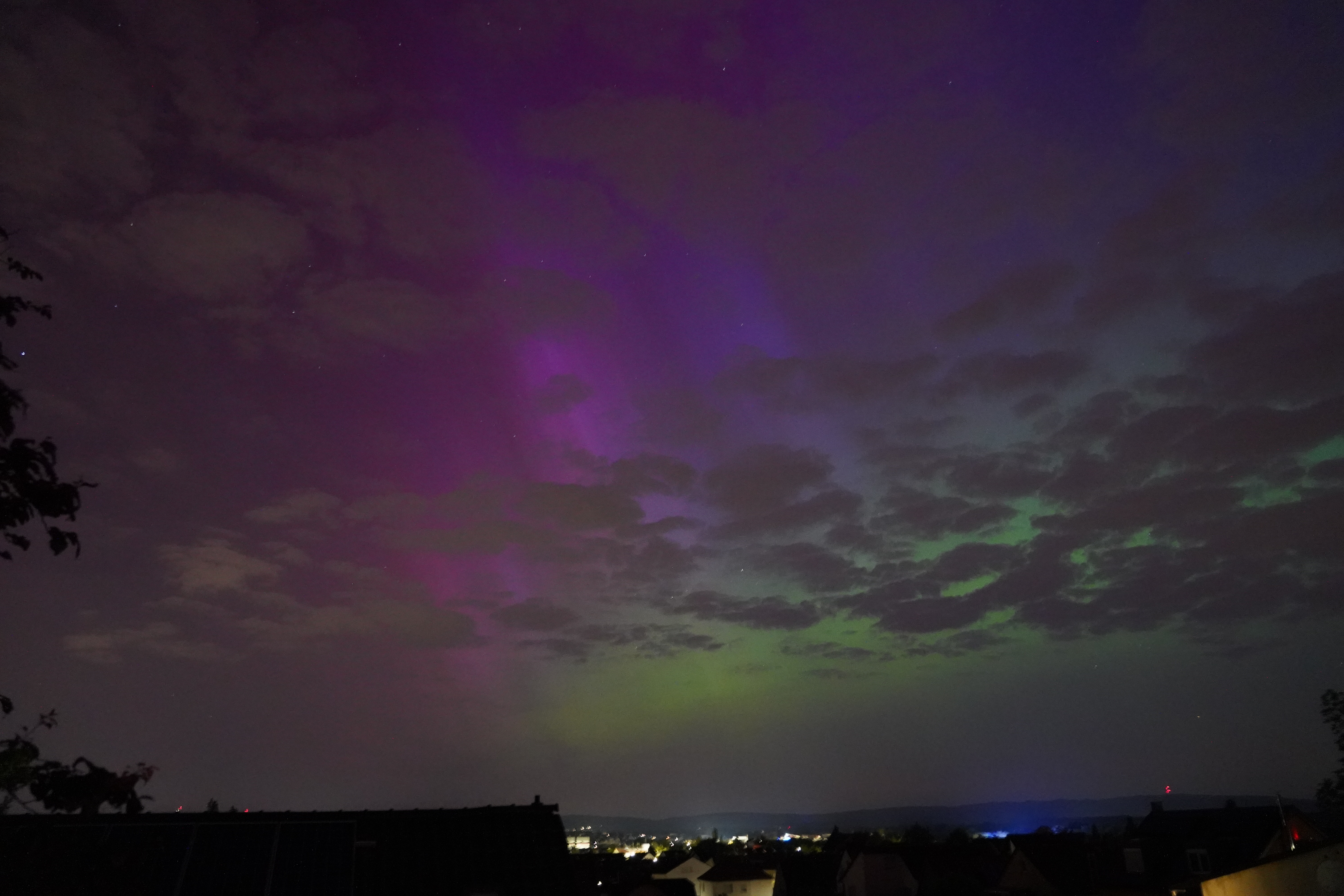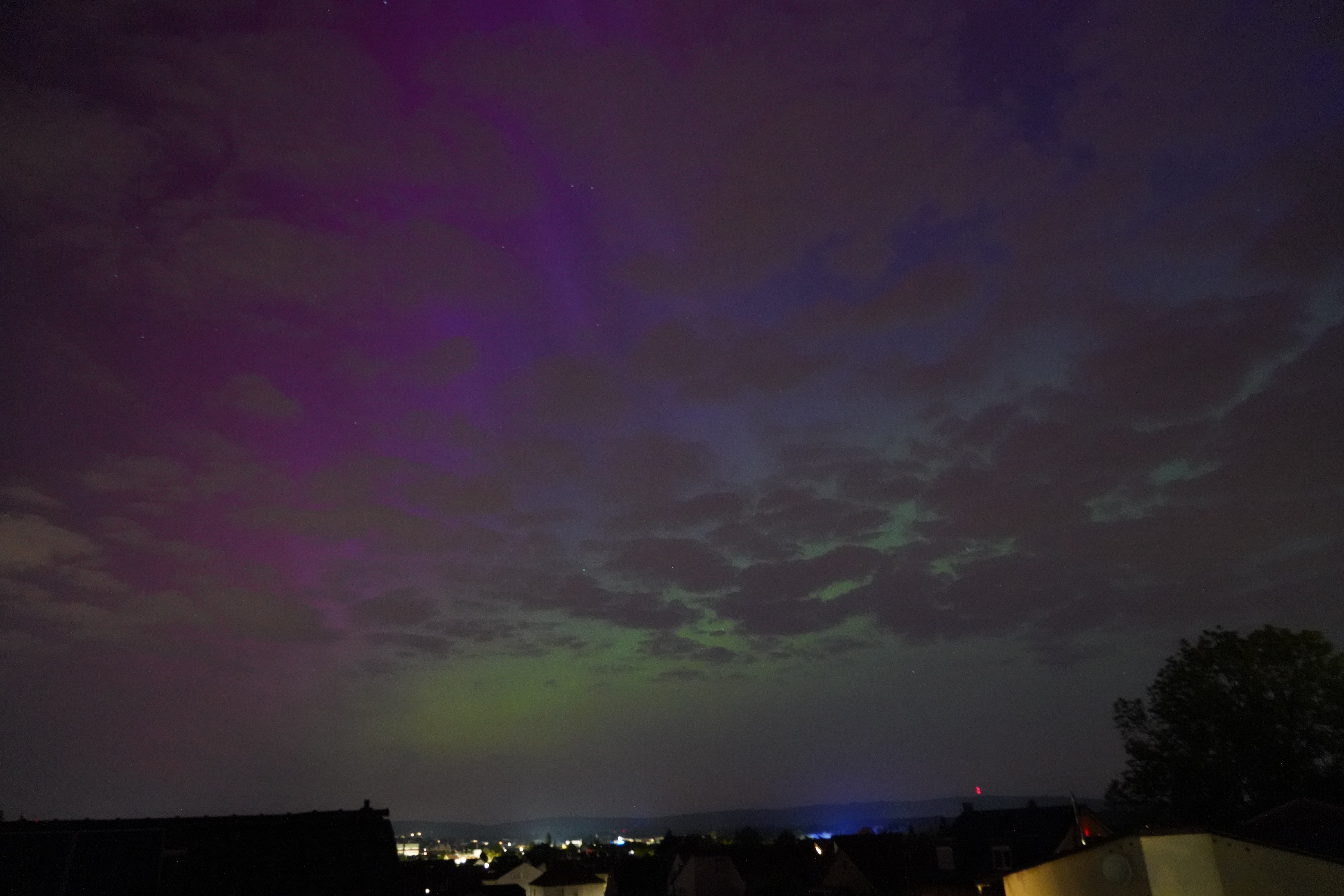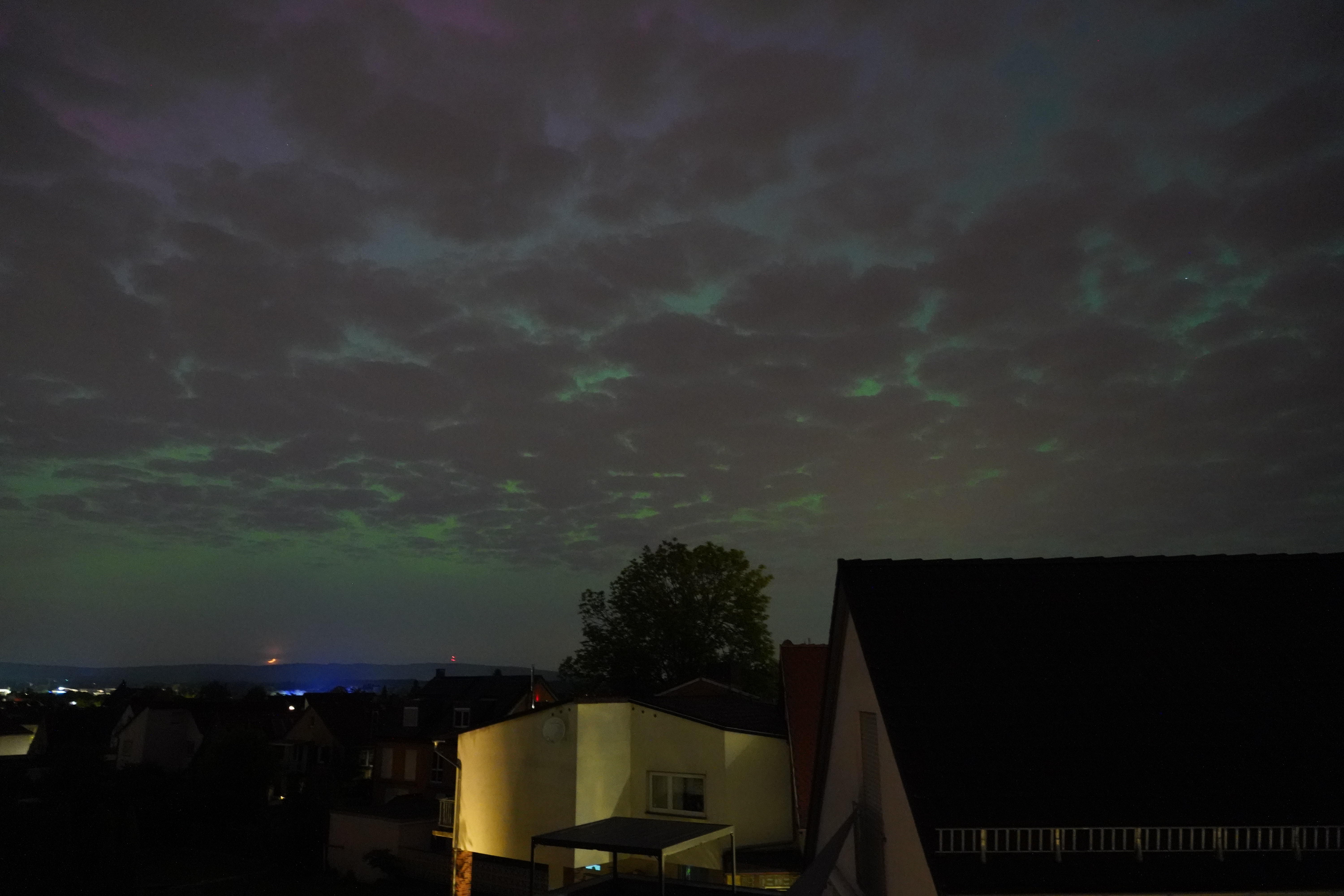 Am 10. Mai stieg der Kp-Wert so hoch über Deutschland (über 7), dass selbst bei uns zu Hause in Karben Polarlichter zu sehen waren, und auch noch in vielen Farben. Der Kp-Wert ist eine Kennziffer (daher "K") von 0 bis 9, welche die Störung des Erdmagnetfelds angibt. Je höher sie ist, umso wahrscheinlicher ist die Sichtung von Polarlichtern.