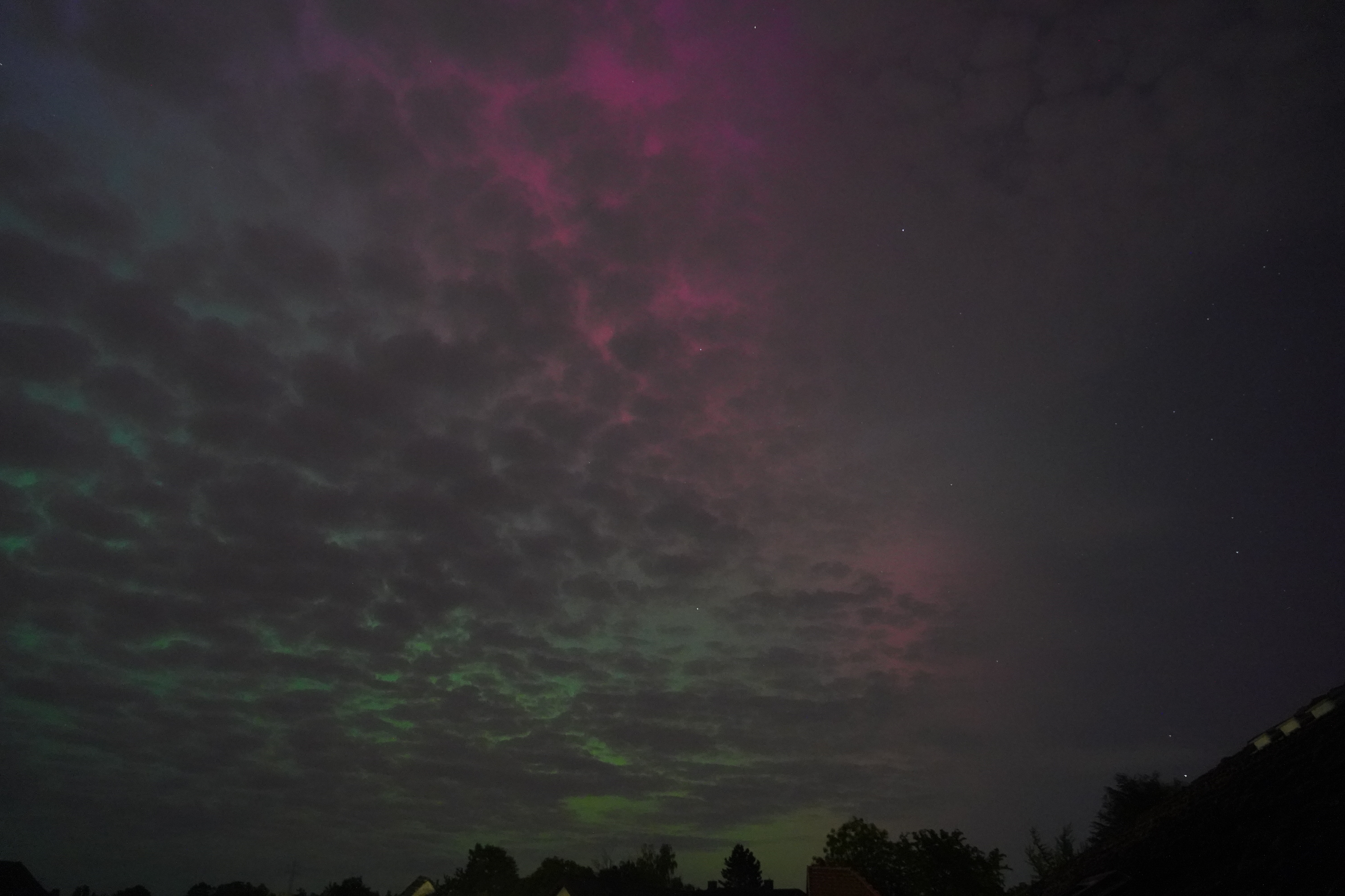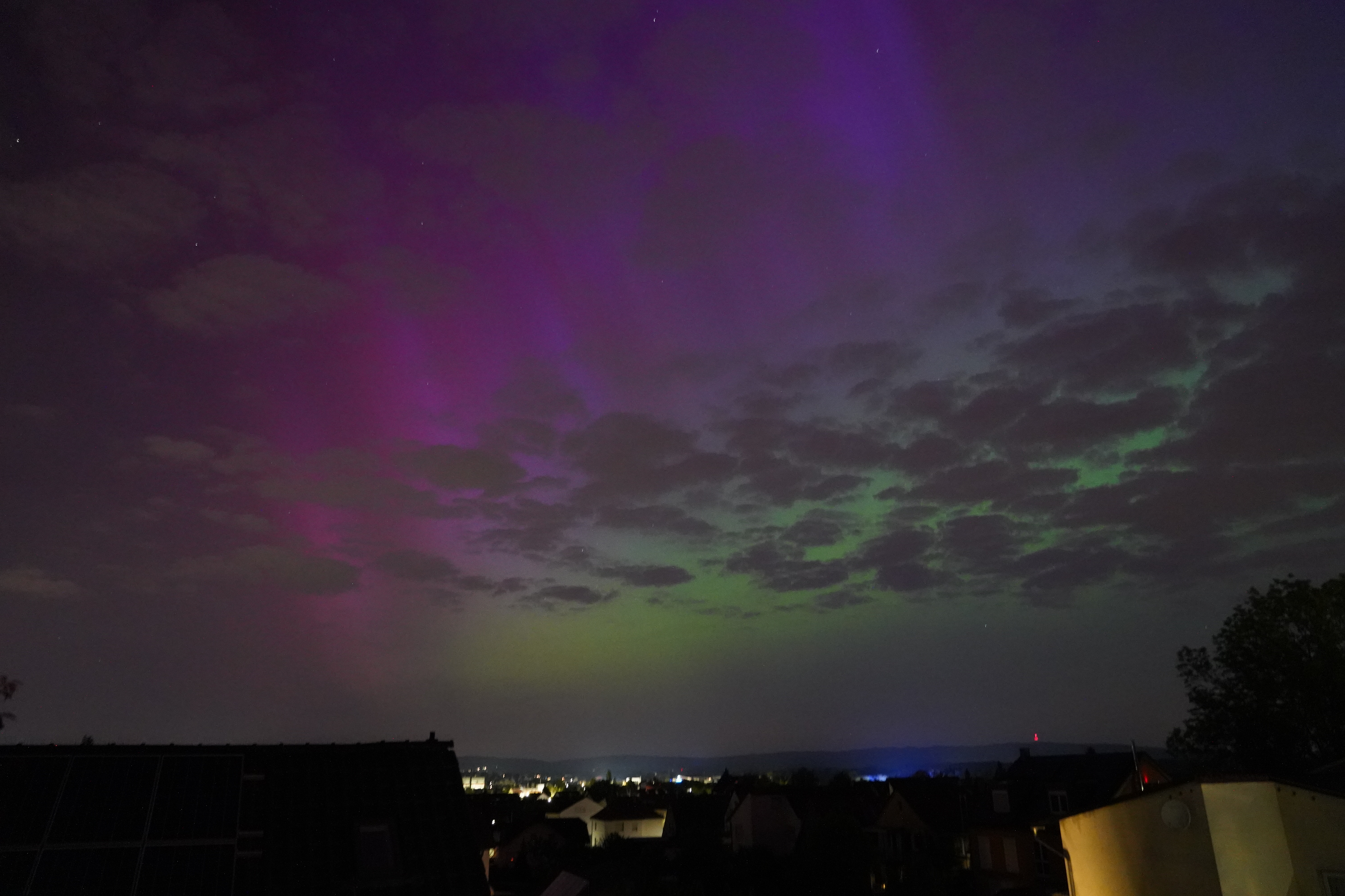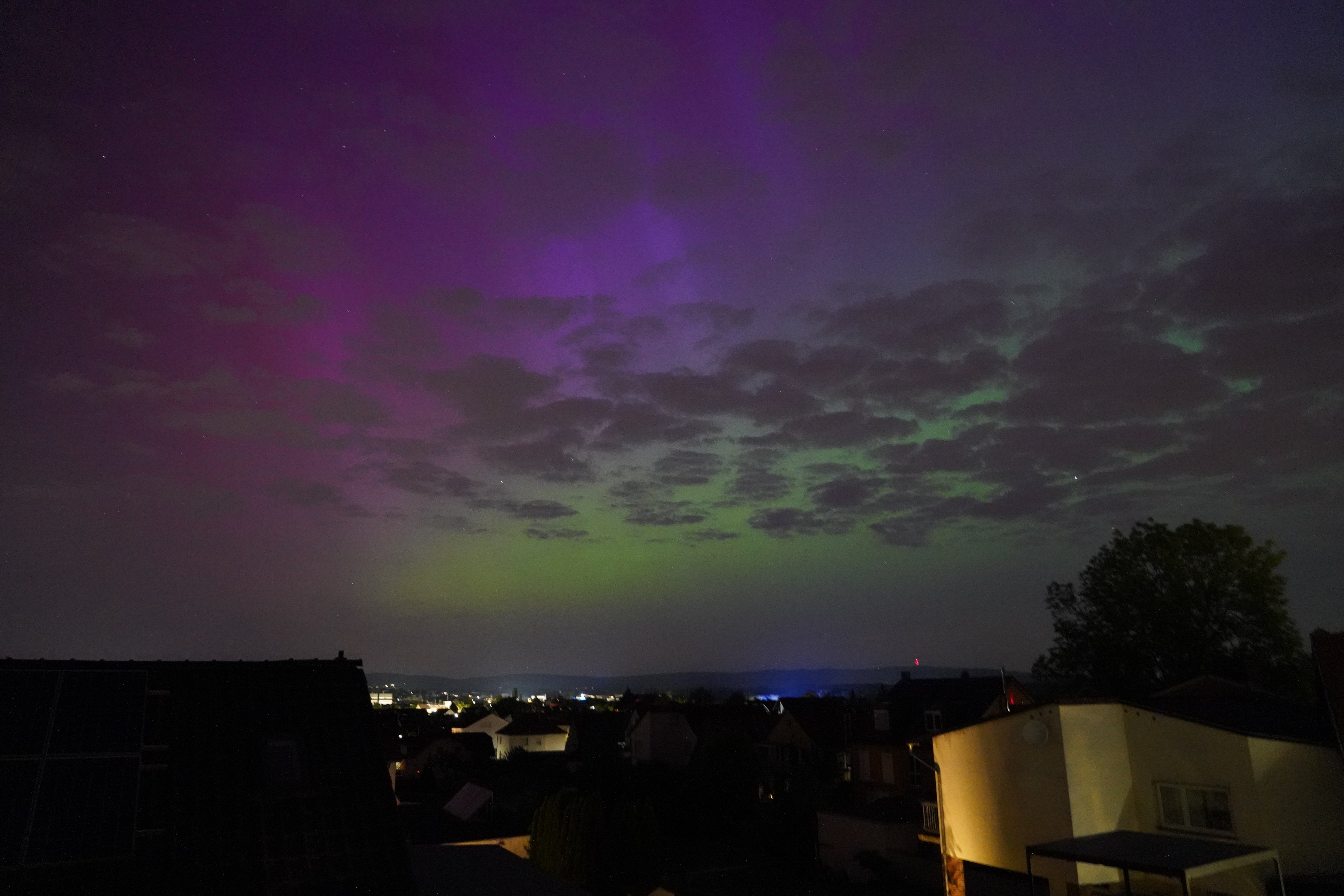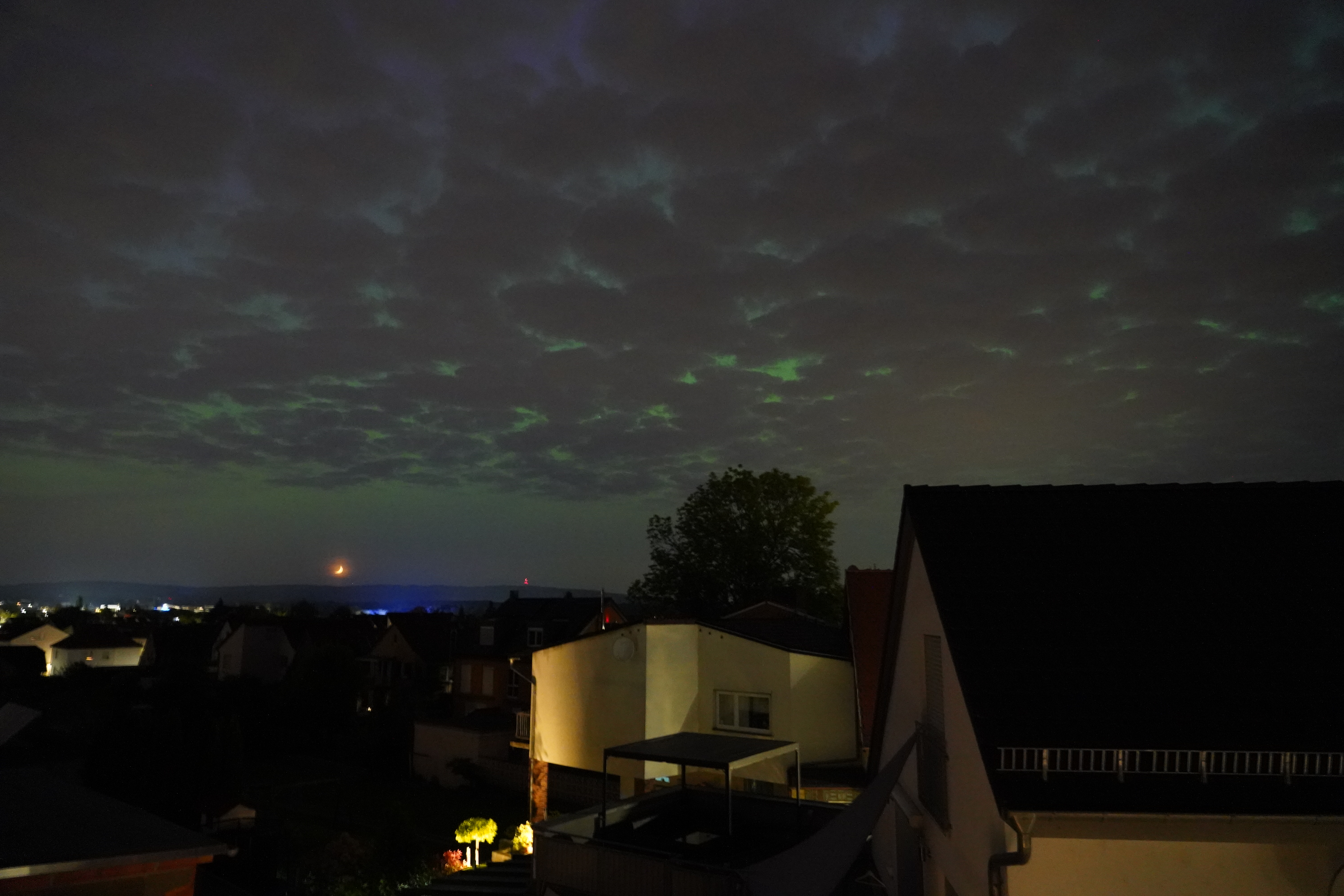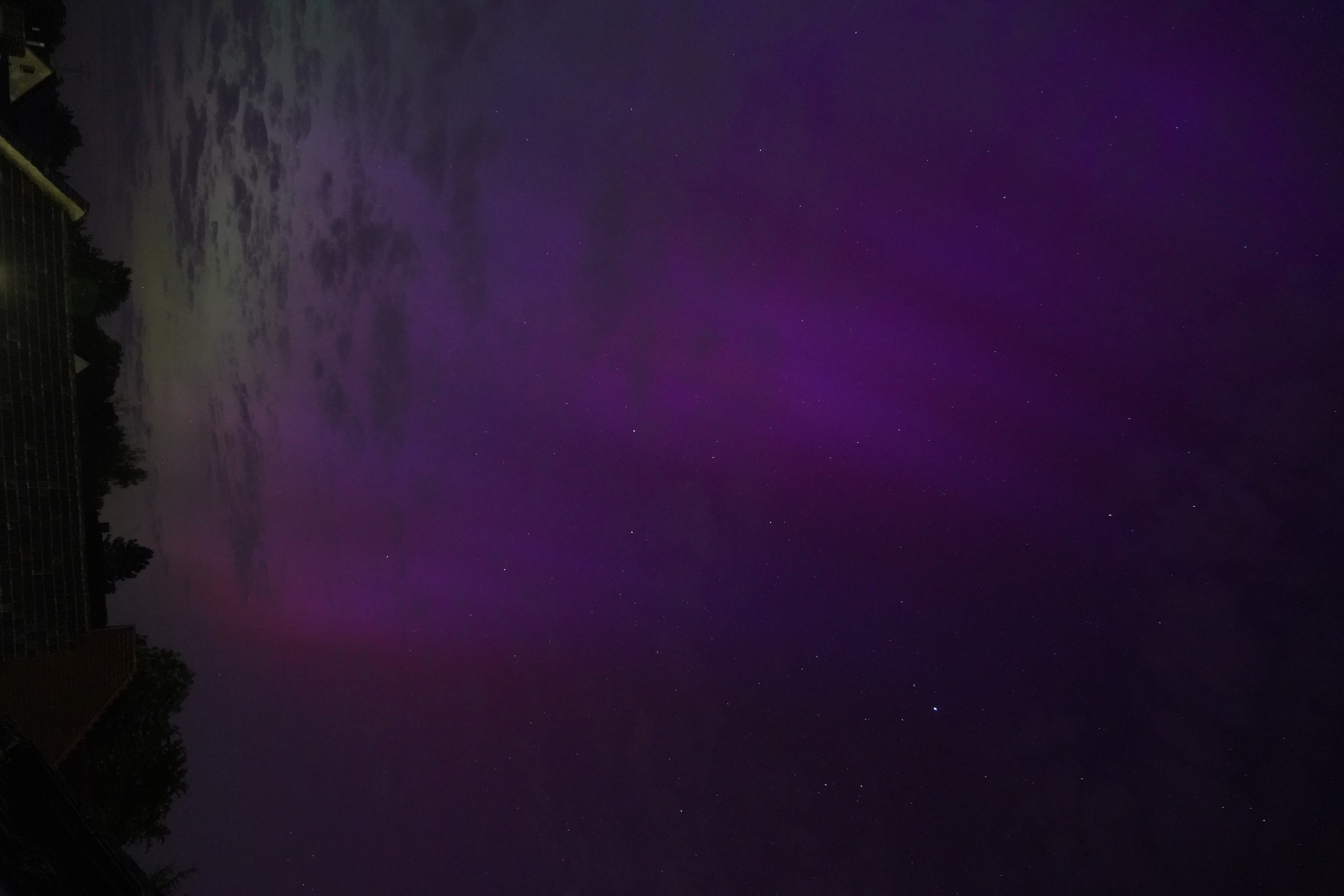 Am 10. Mai stieg der Kp-Wert so hoch über Deutschland (über 7), dass selbst bei uns zu Hause in Karben Polarlichter zu sehen waren, und auch noch in vielen Farben. Der Kp-Wert ist eine Kennziffer (daher "K") von 0 bis 9, welche die Störung des Erdmagnetfelds angibt. Je höher sie ist, umso wahrscheinlicher ist die Sichtung von Polarlichtern.
