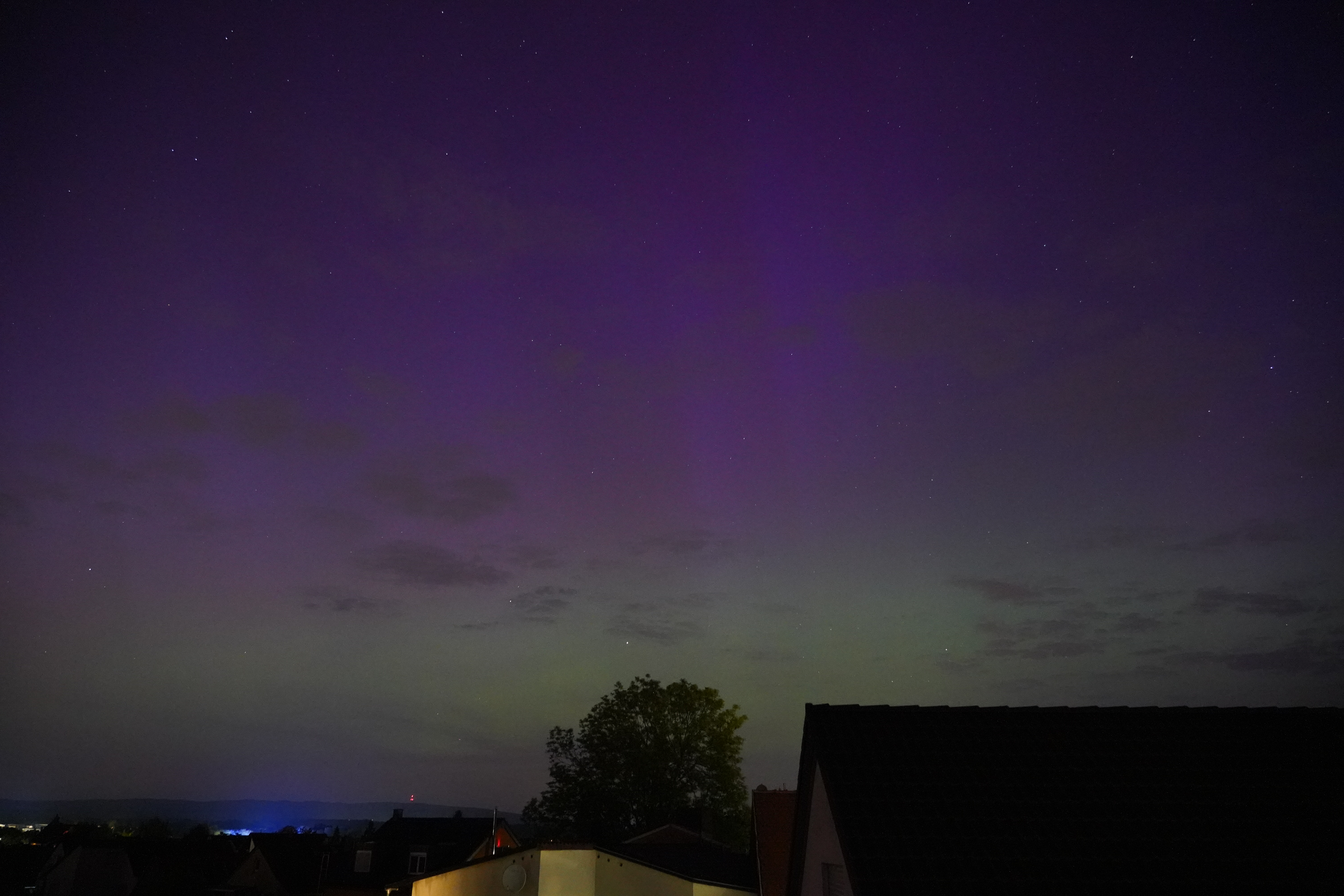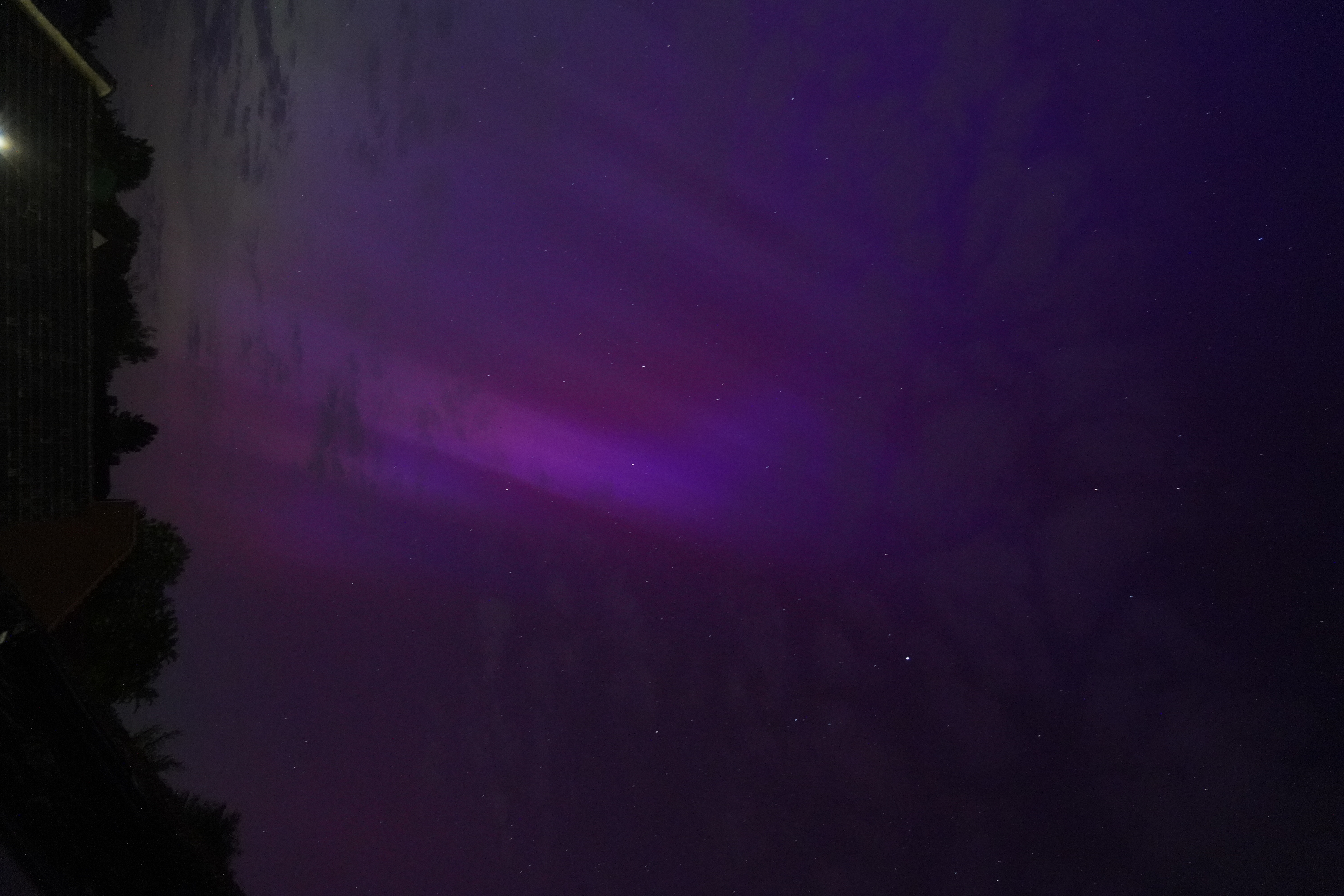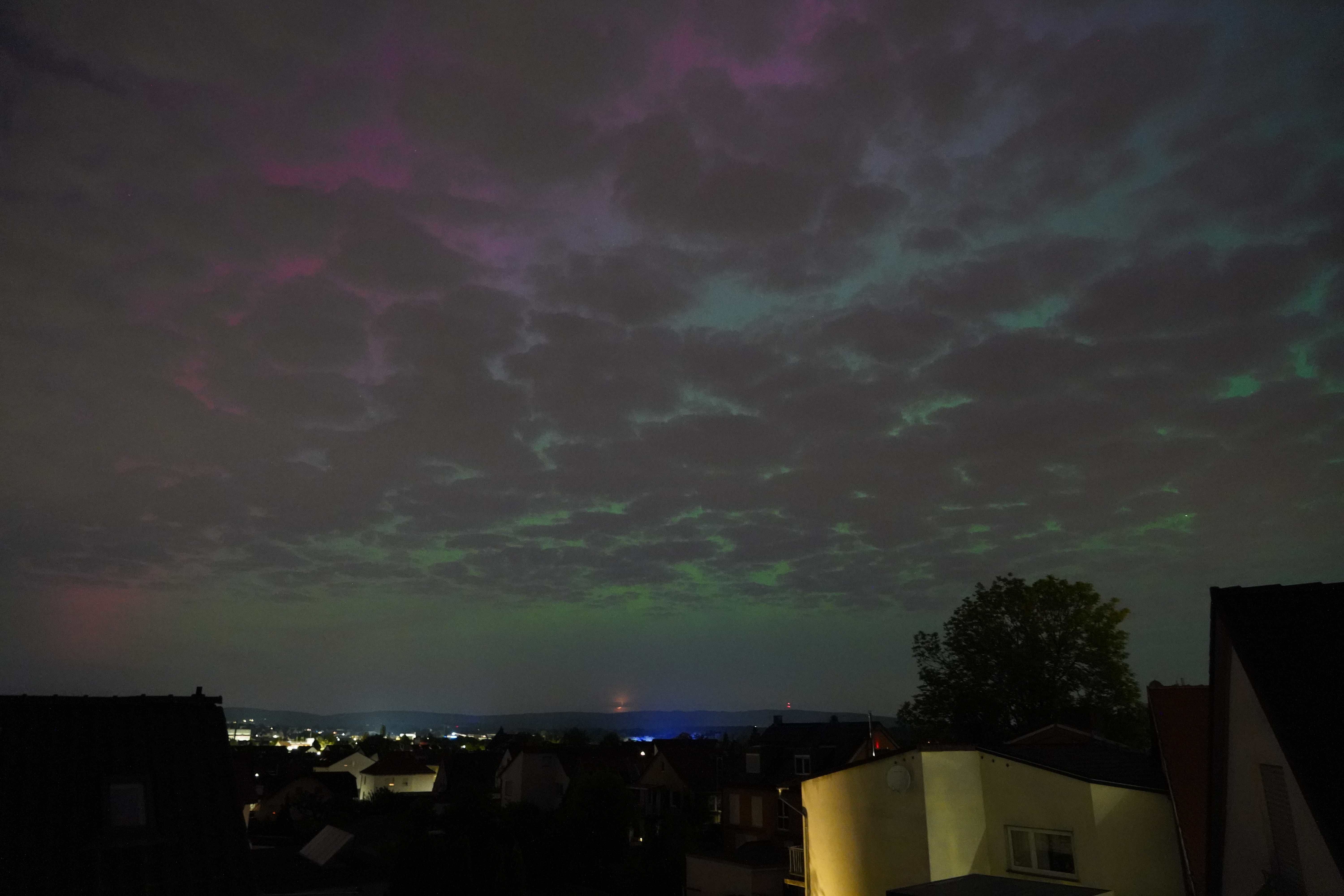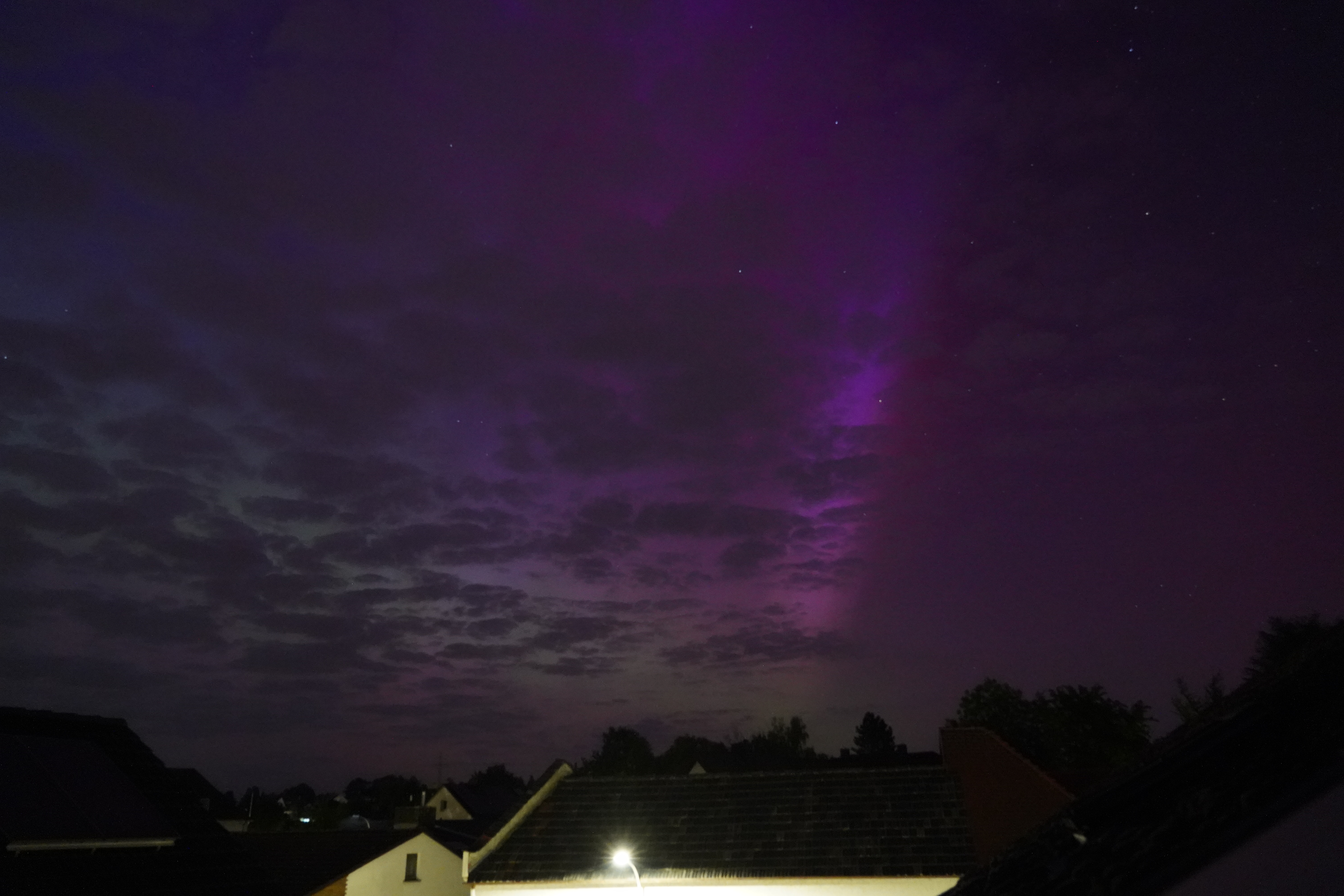 Am 10. Mai stieg der Kp-Wert so hoch über Deutschland (über 7), dass selbst bei uns zu Hause in Karben Polarlichter zu sehen waren, und auch noch in vielen Farben. Der Kp-Wert ist eine Kennziffer (daher "K") von 0 bis 9, welche die Störung des Erdmagnetfelds angibt. Je höher sie ist, umso wahrscheinlicher ist die Sichtung von Polarlichtern.