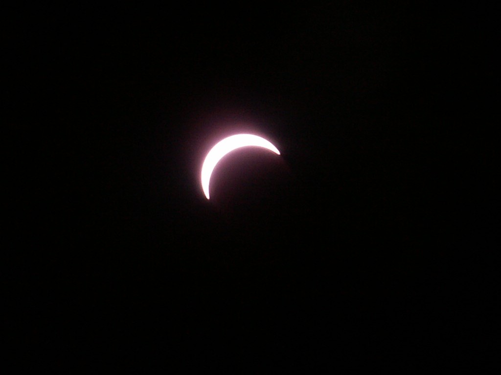 "Bereithalten, die Filter abzunehmen" - ich nahm sie gleich ab, es wird den Fotoapparaten nicht schaden. Es ist nochmal dunkler geworden, und man konnte die LCD-Anzeigen auf den Kameras nicht mehr erkennen. Ich blickte hoch - wie sieht sie aus? Es ist immer noch eine kleine Sichel (auch dies sah ich 1999 schon, bevor sich die Regenwolke davorschob), und da schiebt sich die Mondscheibe tatsächlich vollständig vor die Sonne!