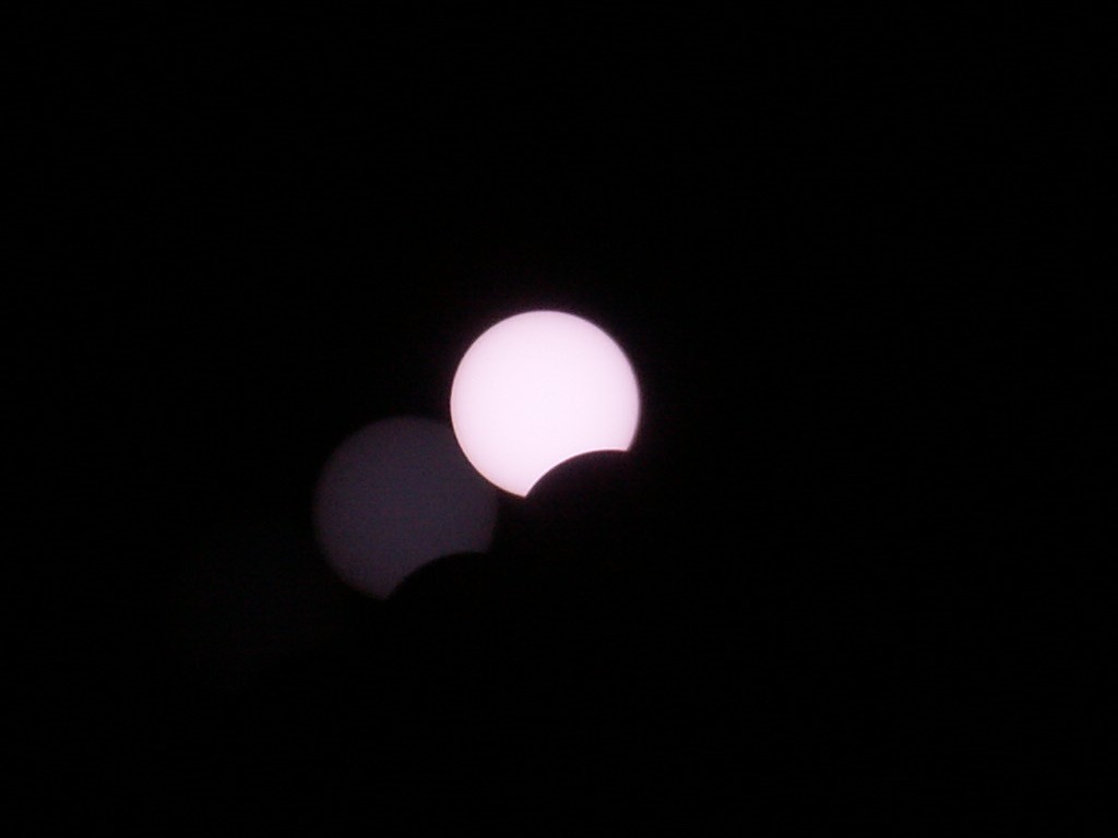 Am Restaurant erwischten uns die ersten Schatten der Wolken und ließen die Sorge wieder anwachsen. Je länger wir fuhren, umso besser wurde die Stimmung, denn die Wolken schienen zurückzubleiben. Kaum 10 Minuten vor eins konnten wir den ersten Kontakt beobachten. Und um 12:54 Uhr ergatterte ich das erste Bild mit meiner Digitalkamera durch das Busfenster.