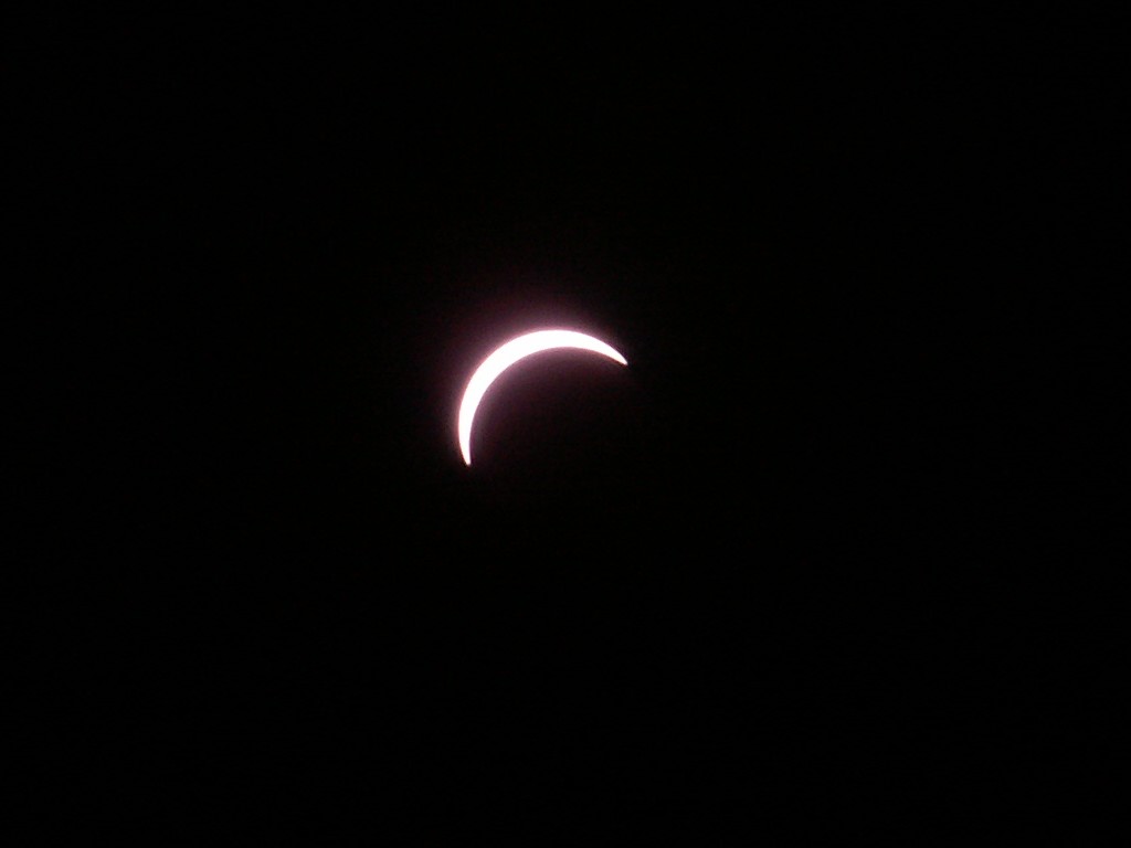 "Bereithalten, die Filter abzunehmen" - ich nahm sie gleich ab, es wird den Fotoapparaten nicht schaden. Es ist nochmal dunkler geworden, und man konnte die LCD-Anzeigen auf den Kameras nicht mehr erkennen. Ich blickte hoch - wie sieht sie aus? Es ist immer noch eine kleine Sichel (auch dies sah ich 1999 schon, bevor sich die Regenwolke davorschob), und da schiebt sich die Mondscheibe tatsächlich vollständig vor die Sonne!