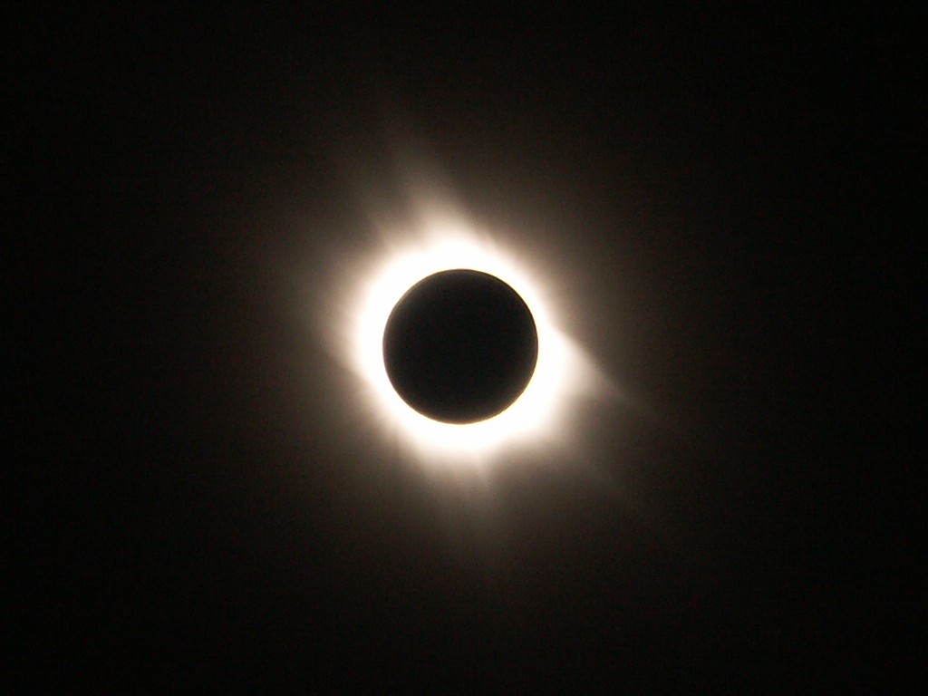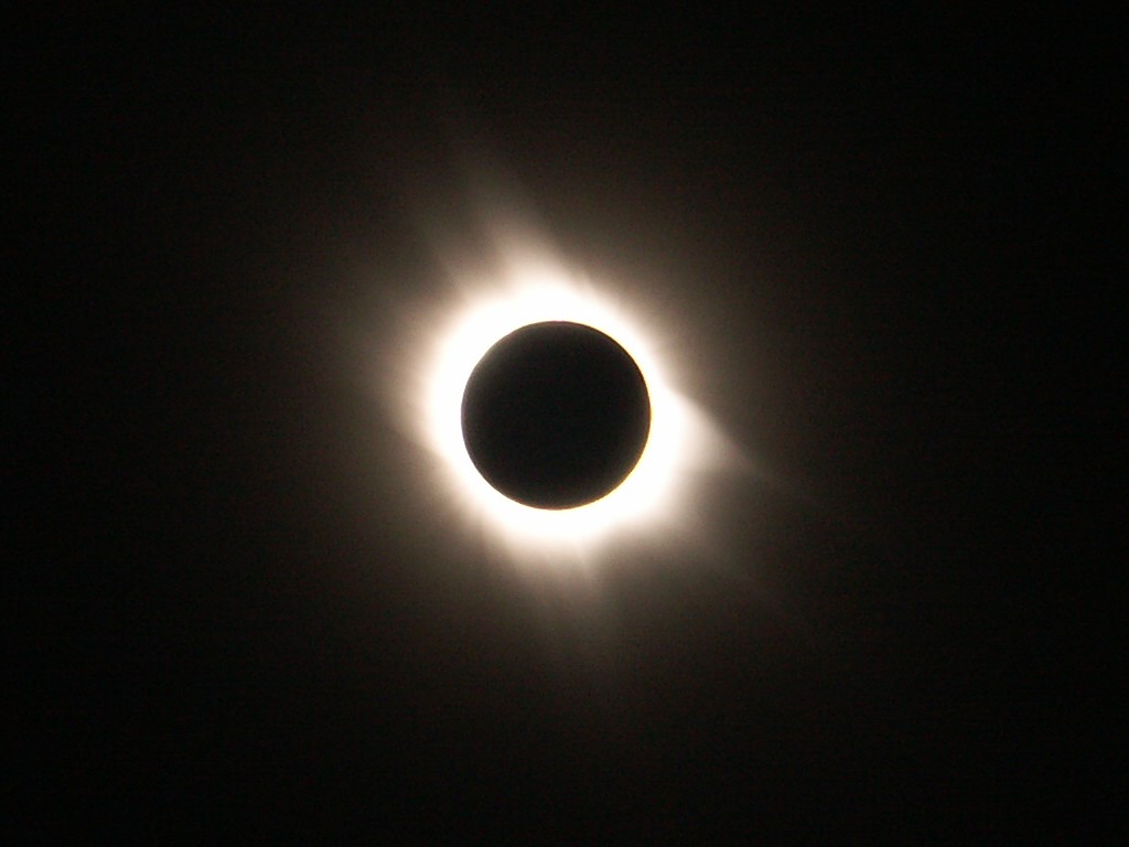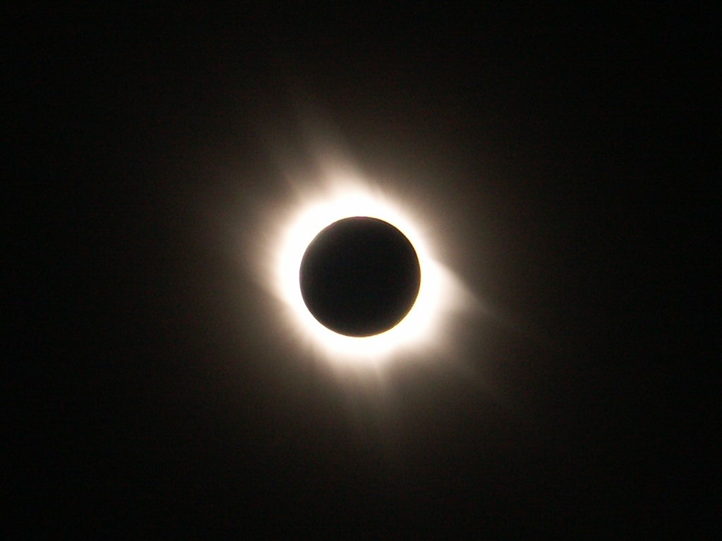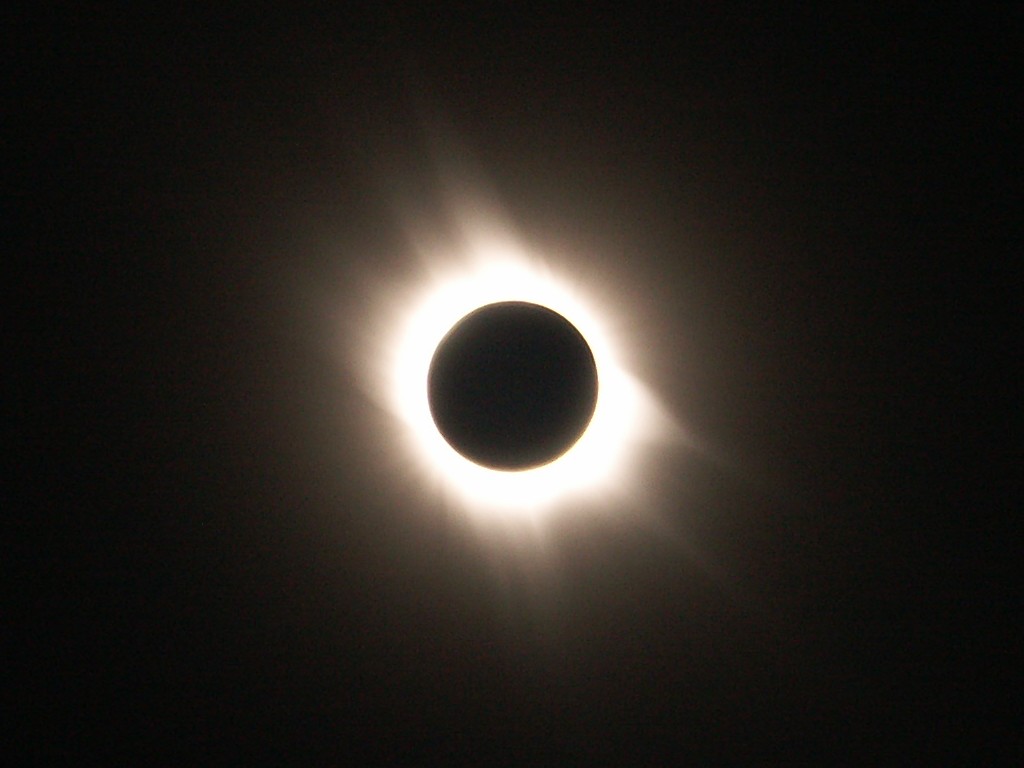 Noch immer kein Tier zu hören; weit weg von der Straße oder irgendeinem Ort, vergehen die Sekunden dieses Erlebnisses. Mir fielen die Fotoapparate ein; ich sollte wieder ein paar Bilder machen. Hoffentlich werden sie gut. Ich sollte nach oben sehen und nicht nur durch die Sucher, und da stand sie noch immer da. So groß ... so unerwartet groß. Ich kannte schon Darstellungen einer Sonnenfinsternis, und ehrlich gesagt war ich darauf eingestellt, etwas von der Größe eines Vollmondes hoch am Himmel zu sehen, umrandet von einer hellen Korona. Aber das, was dort zu sehen war, erschien geradezu riesig. Tatsächlich war die Korona links und rechts von der Sonne derart weit ausfasernd, dass die Scheibe mühelos nochmal auf beide Seiten gepasst hätte. Dieses Ding, das am Himmel auf uns herunterdröhnte - ja, dröhnen war das Wort, das mir immer wieder in den Sinn kam -, wäre es von einem Donnergrollen begleitet gewesen, man hätte es hingenommen. Aber so stand es da oben, prangte da oben, und tat dies in völliger Ruhe.