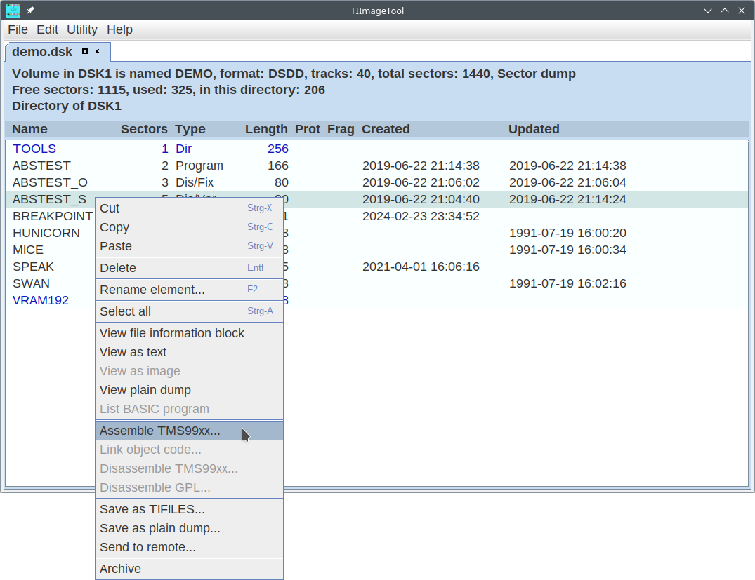 There are two kinds on menus in TIImageTool: the dropdown menus from the menu line, and the context menu. The selectable actions of the context menu depend on the file where the menu has been opened. Also, you can open a context menu below the file listing in order to operate on the volume itself, like for creating new files and directories.On the left you can see the context menu opened over the file ARCTEST_S. Possible actions are cutting / copying the file, renaming it, working with its content, sending/saving it, or archiving it. For instance, the screenshot shows that we are about to invoke the assembler (external tool) to create an object code file from this assembly source code file.