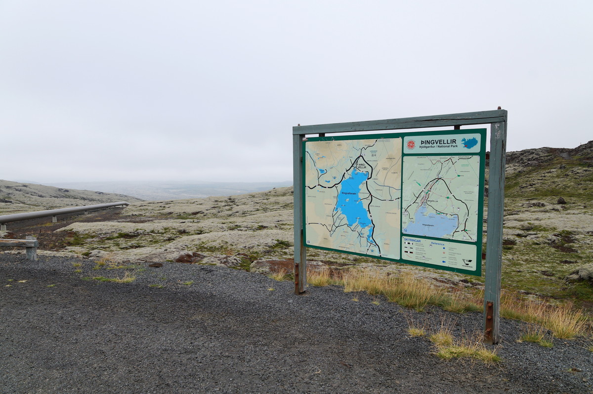 Now we commence with the Gullni Hringurinn, the Golden Circle: First is Þingvellir (Thingvellir), the most important national park of Iceland. 1000 years ago, Vikings assembled regularly in this plain. Þingvellir is located on a rift between the tectonic plates, which can easily be seen by the steep rock walls.