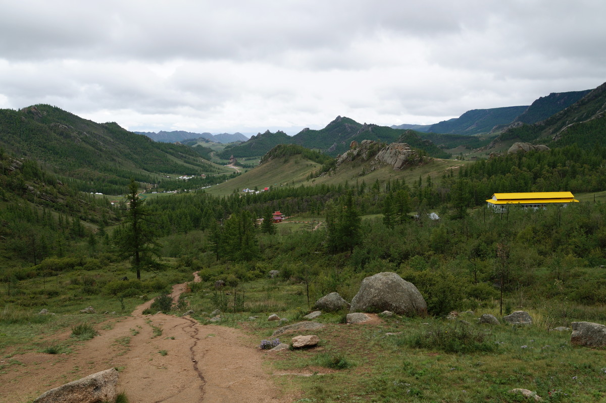 Khan Khentii National Park (Töv). We arrive at the Khan Khentii National Park and encounter the huge statue of Genghis Khan, made of stainless steel. This area is said to be the birthplace of the Mongol Leader. What spoils the impressive look is that this monument was created in 2008; not really an antique artifact but modern history. We pass the Turtle Rock at the Terelj road and arrive at the last program item, the visit to the Aryabal meditation center. We enjoy a marvellous view over the grassy landscape.