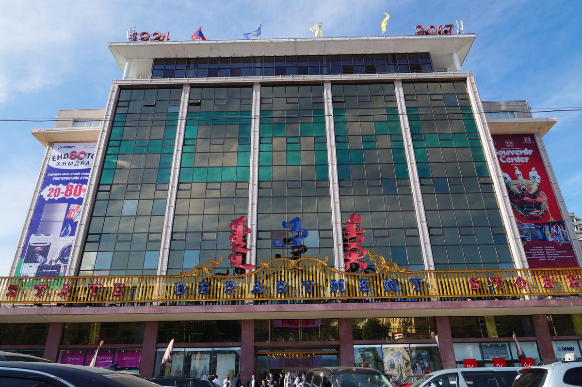 Back in Ulaanbaatar. Our bus brings us back to the capital city, Ulaanbaatar. Before we drive to the hotel, we have a stop at the Mongolian Cashmere Center. I'm not really interested in getting a cashmere pullover, so I have a walk through the streets, and I notice that we are close to the Bogd Khan Winter Palace, which we know from the second day. Then we have another stop at the Ikh Delgüür (State Department Store), a huge shopping mall.